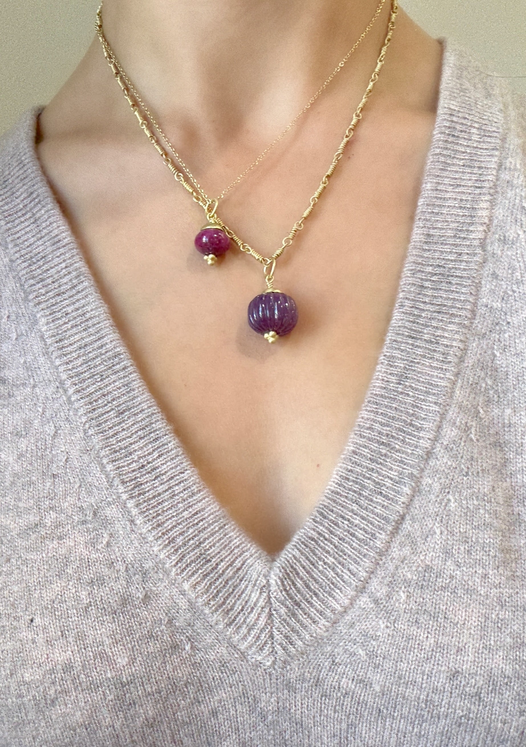 18k Gold Carved Ruby Bead Pendant with Granulation detail