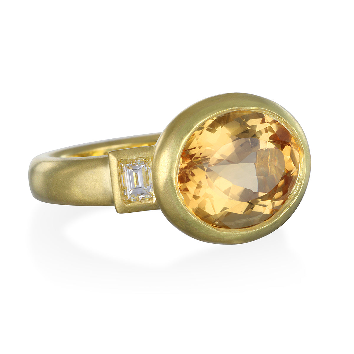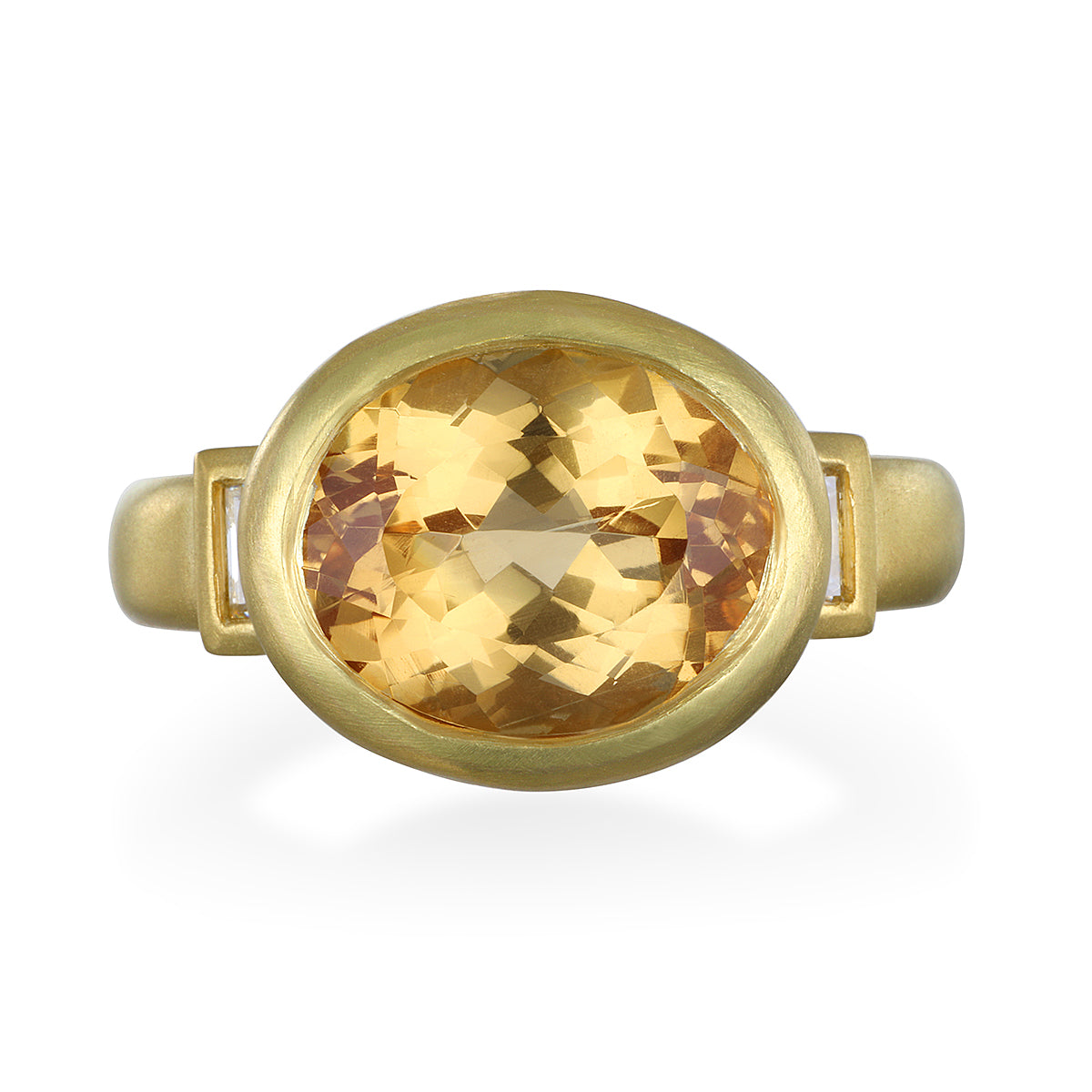 18k Gold Imperial Topaz 3-Stone Ring with Diamond Baguettes