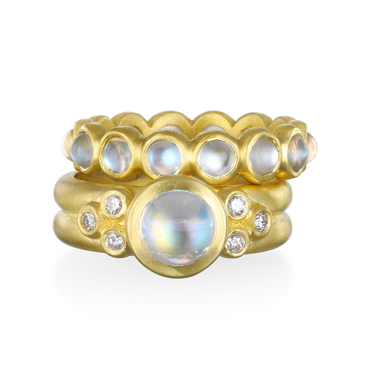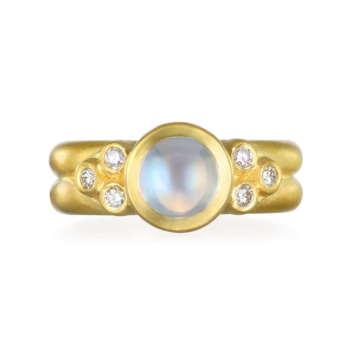18k Gold Ceylon Moonstone Ring with Triple Diamond Granulation Beads
