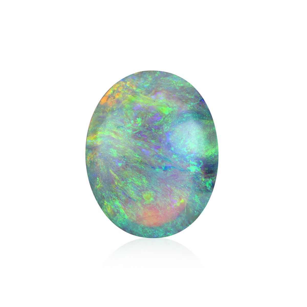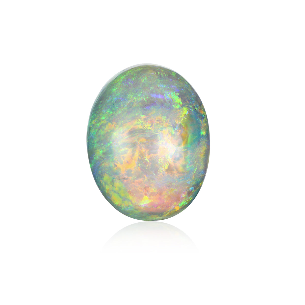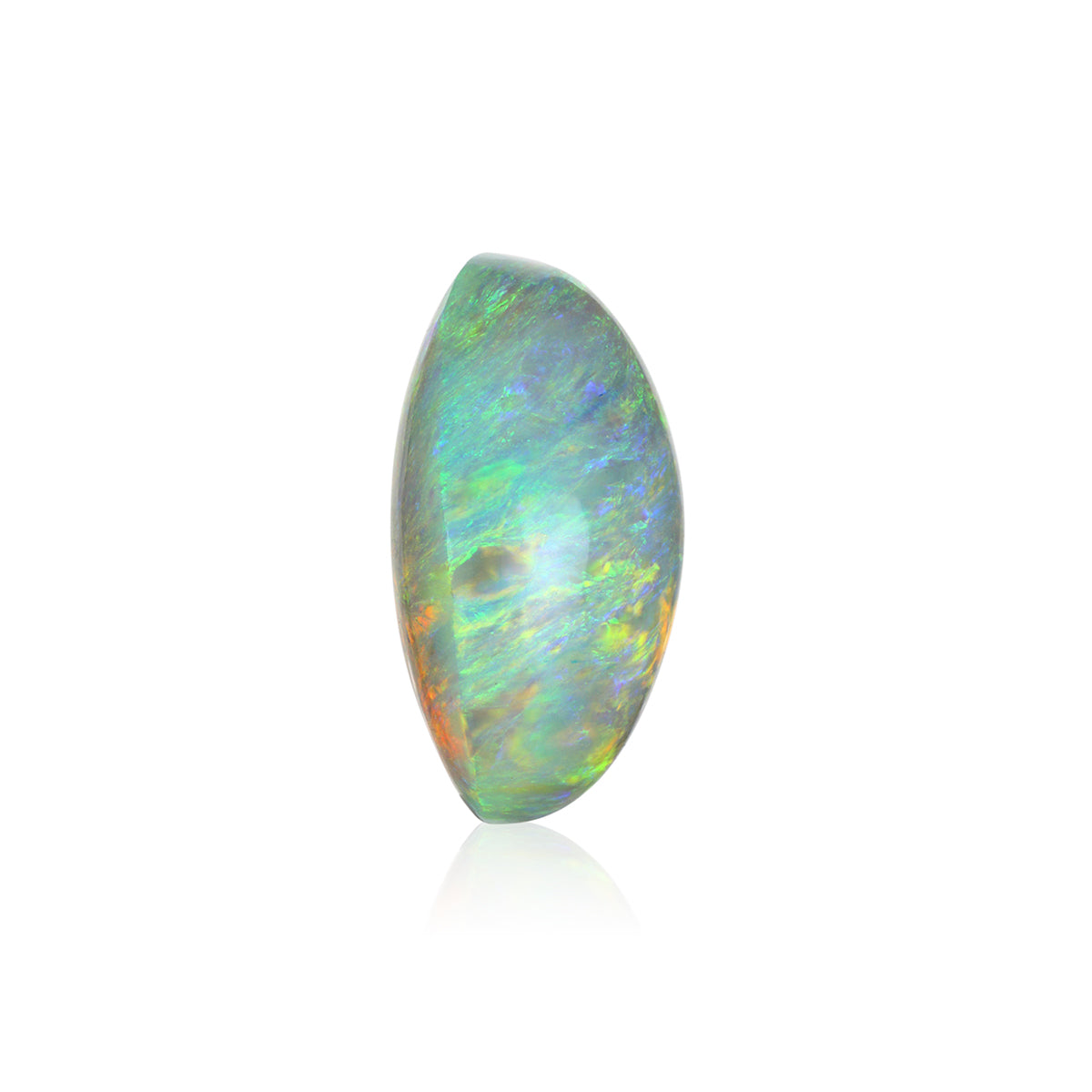 Spectacular in size, color, and shape and exhibiting a stunning range of colors, this 19.37 carat oval crystal opal is a gem-quality stone for the avid collector or jewelry lover. The stone's calming and mesmerizing hues render it ideal for creating a truly one of a kind statement ring, bracelet, necklace, or pendant/brooch. Let us help you design your own signature piece. For inspiration, see some of the opal pieces Faye Kim has created in the attached photos. The designer will work with you to create your own spectacular, one-of-a-kind piece using any of our loose stones.