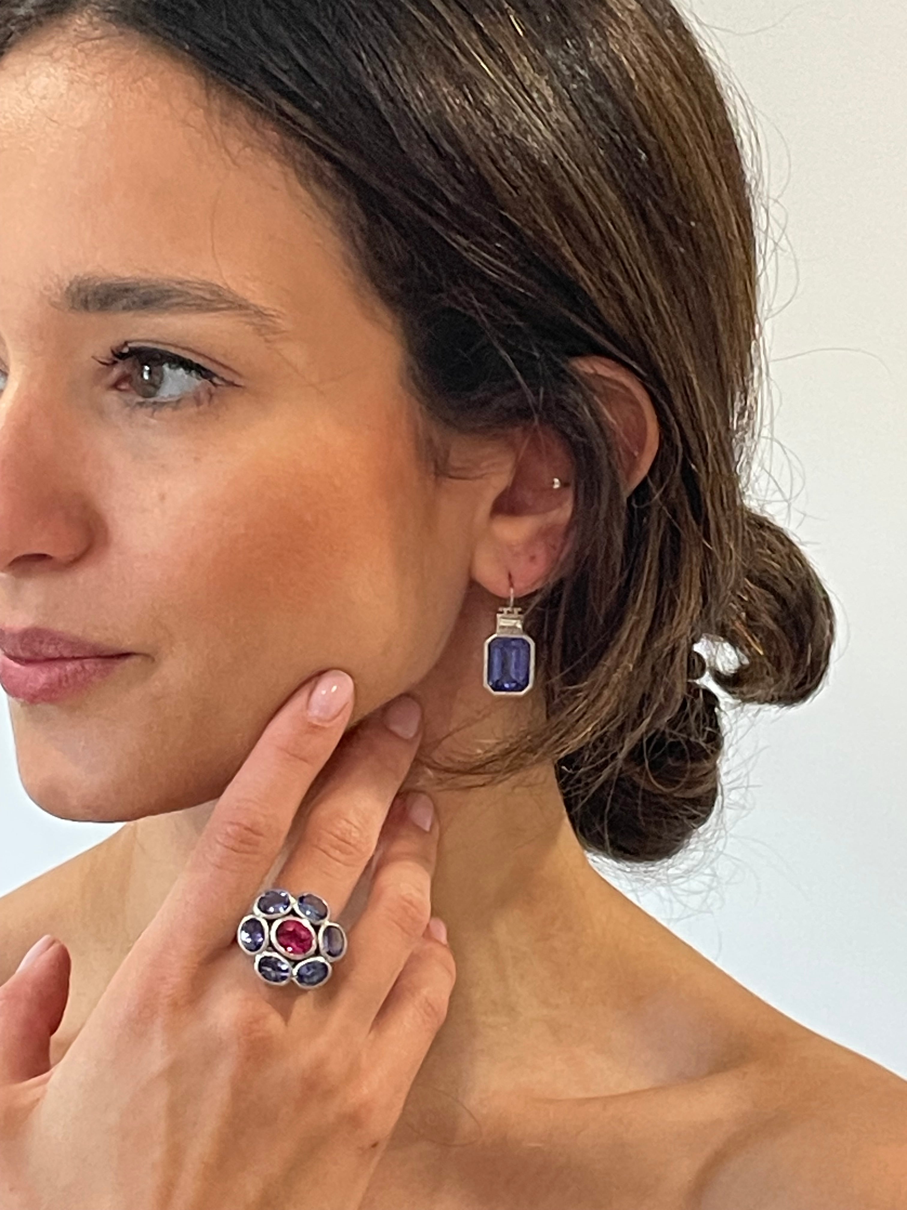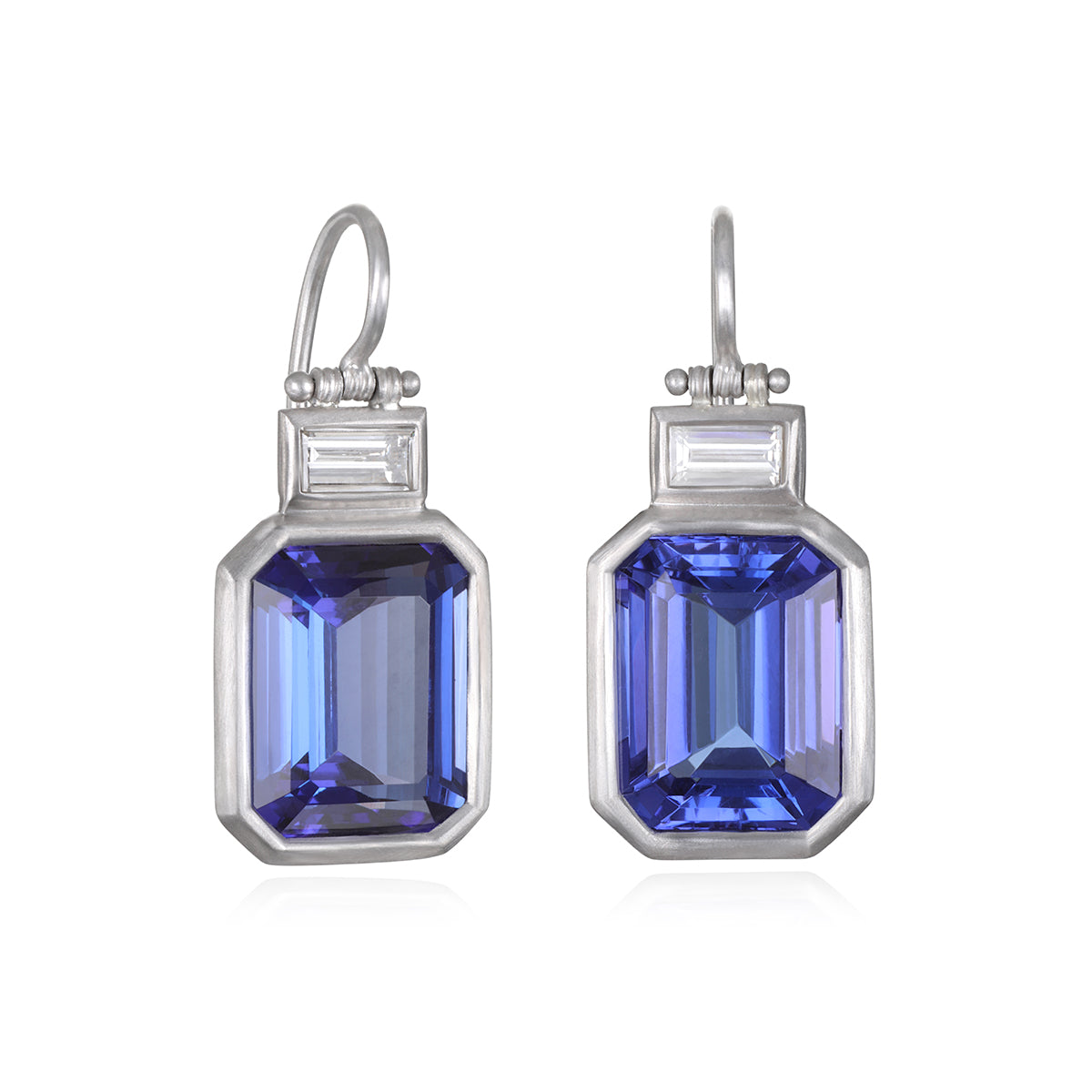 Platinum Tanzanite Earrings with Diamond Baguette Hinge