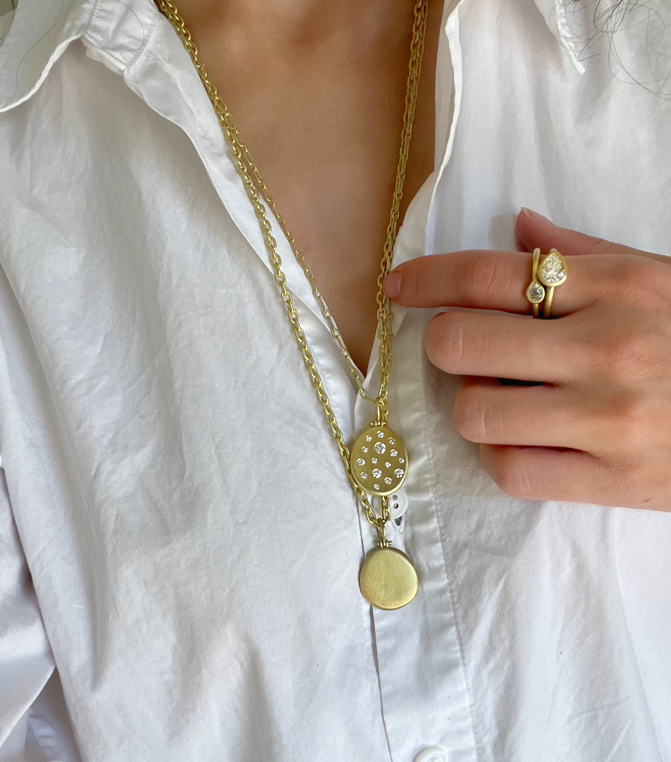 Pictured on an 18k Gold Mini Paperclip Vintage Link Chain, sold separately