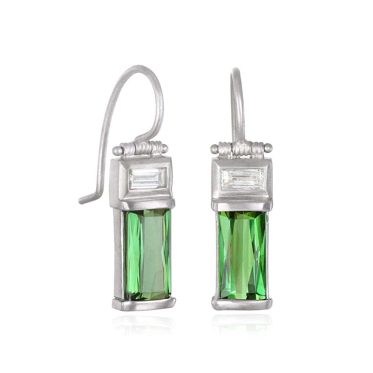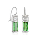 18k White Gold Diamond Tourmaline Baguette Earrings - Matte Finished with Hinged Wires