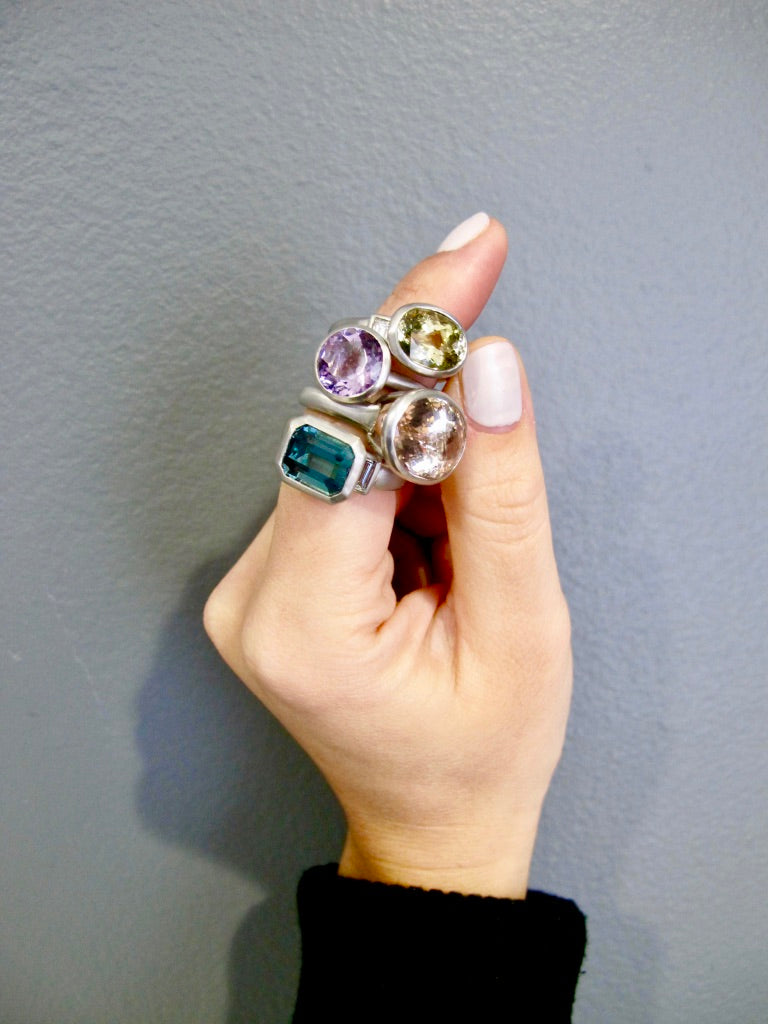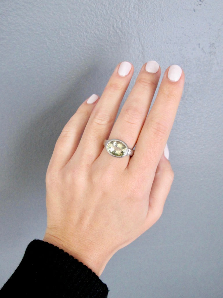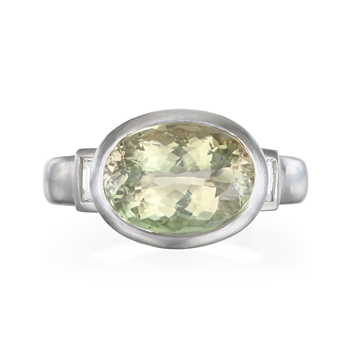 Platinum oval faceted Celery Tourmaline bezel ring with diamond baguettes