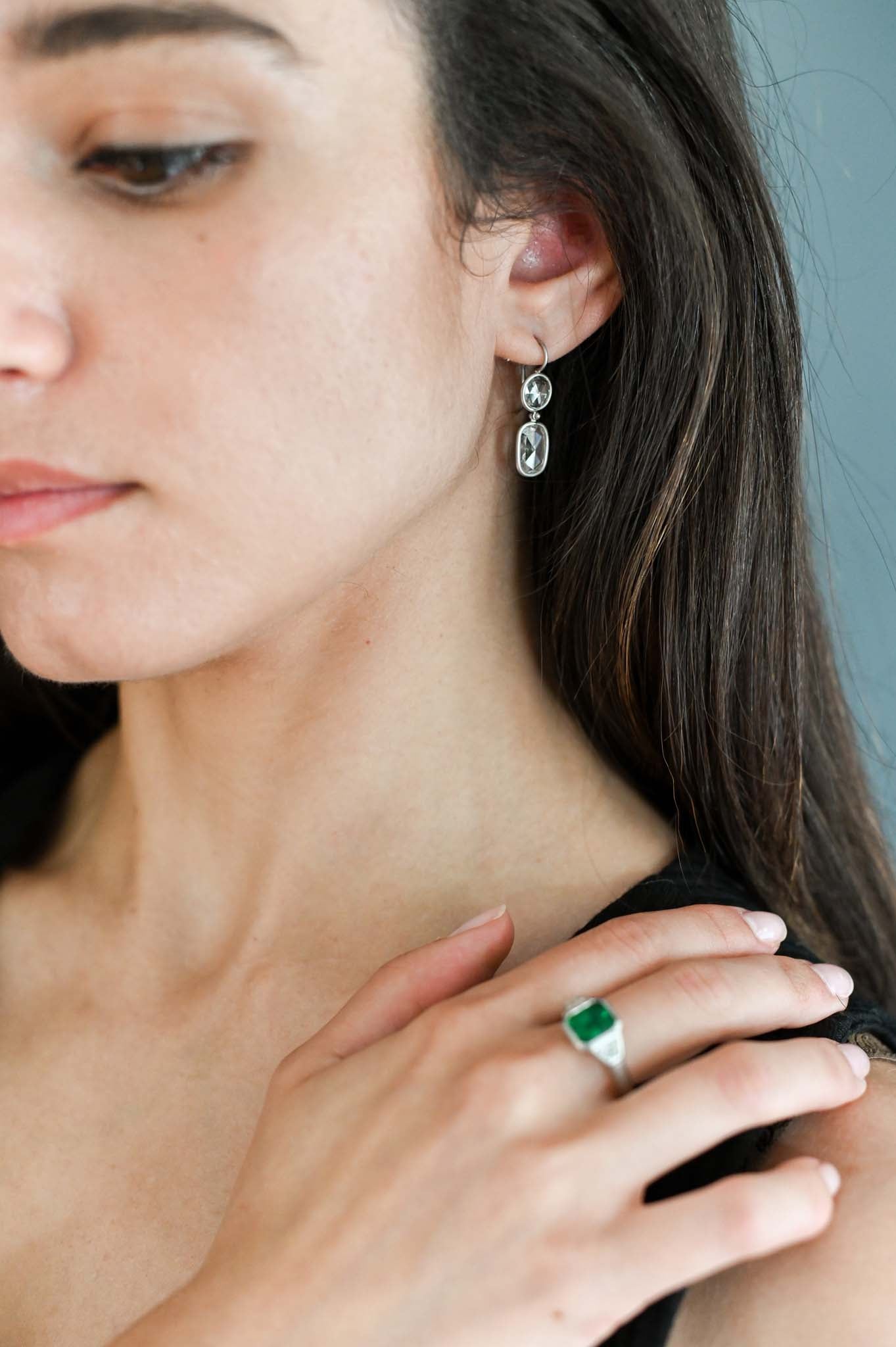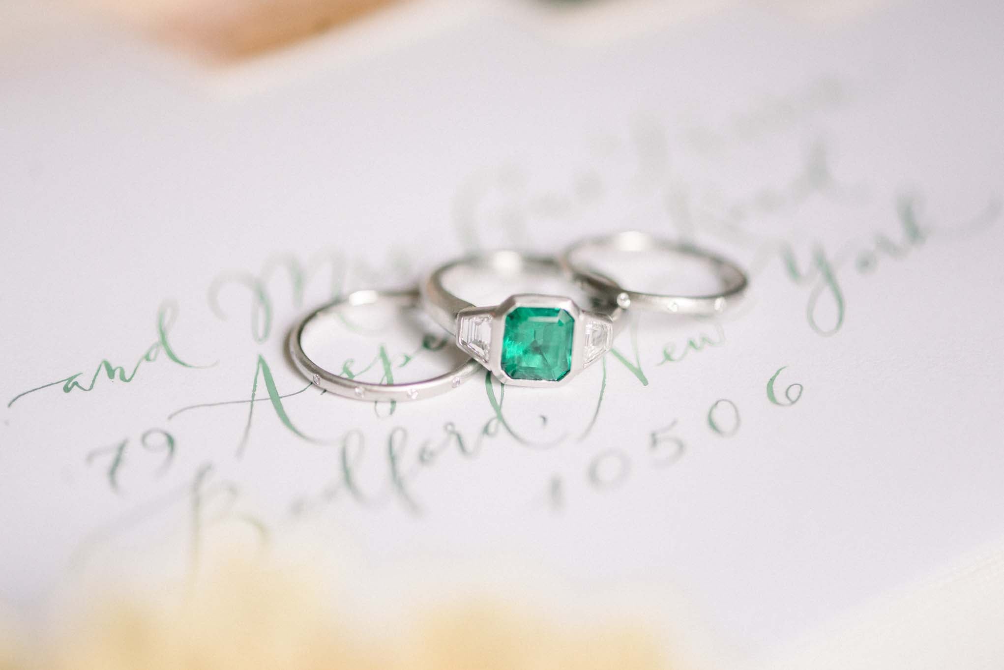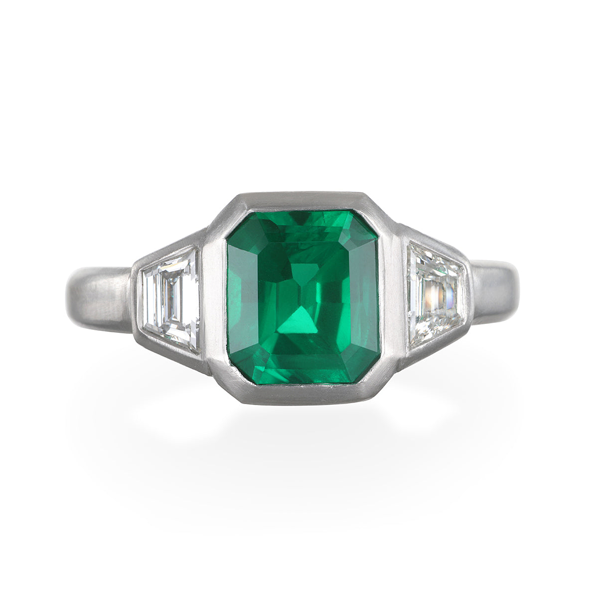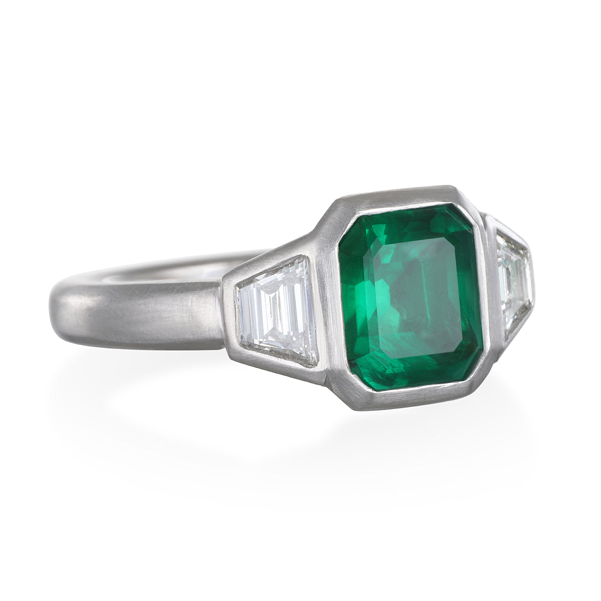 Timeless Three Stone Emerald and Diamond Bezel. Set in Platinum and beautifully crafted, the Brazilian Emerald is flanked by diamond trapezoids, highlighting the deep, beautiful green hue.