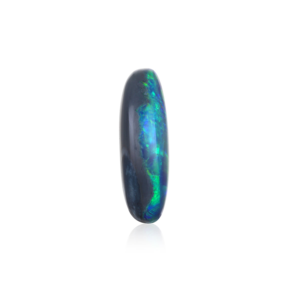 Lightning Ridge Natural Black Opal: Spectacular in color and shape and exhibiting a stunning range of colors, this 4.75 carat natural black opal is a gem-quality stone for the avid collector or jewelry lover.
