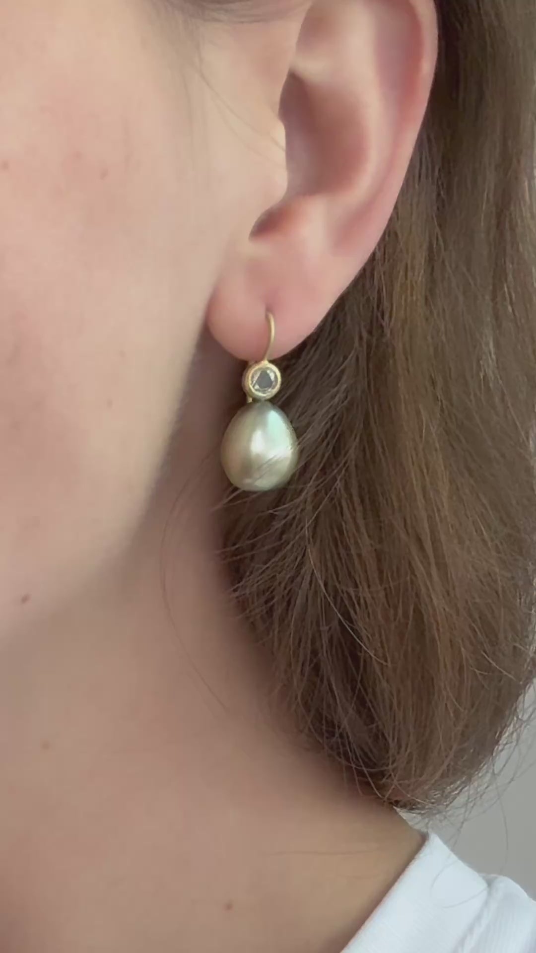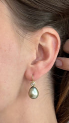 18k Gold Pistachio Tahitian Pearl Drop Earrings with Rose Cut Diamonds