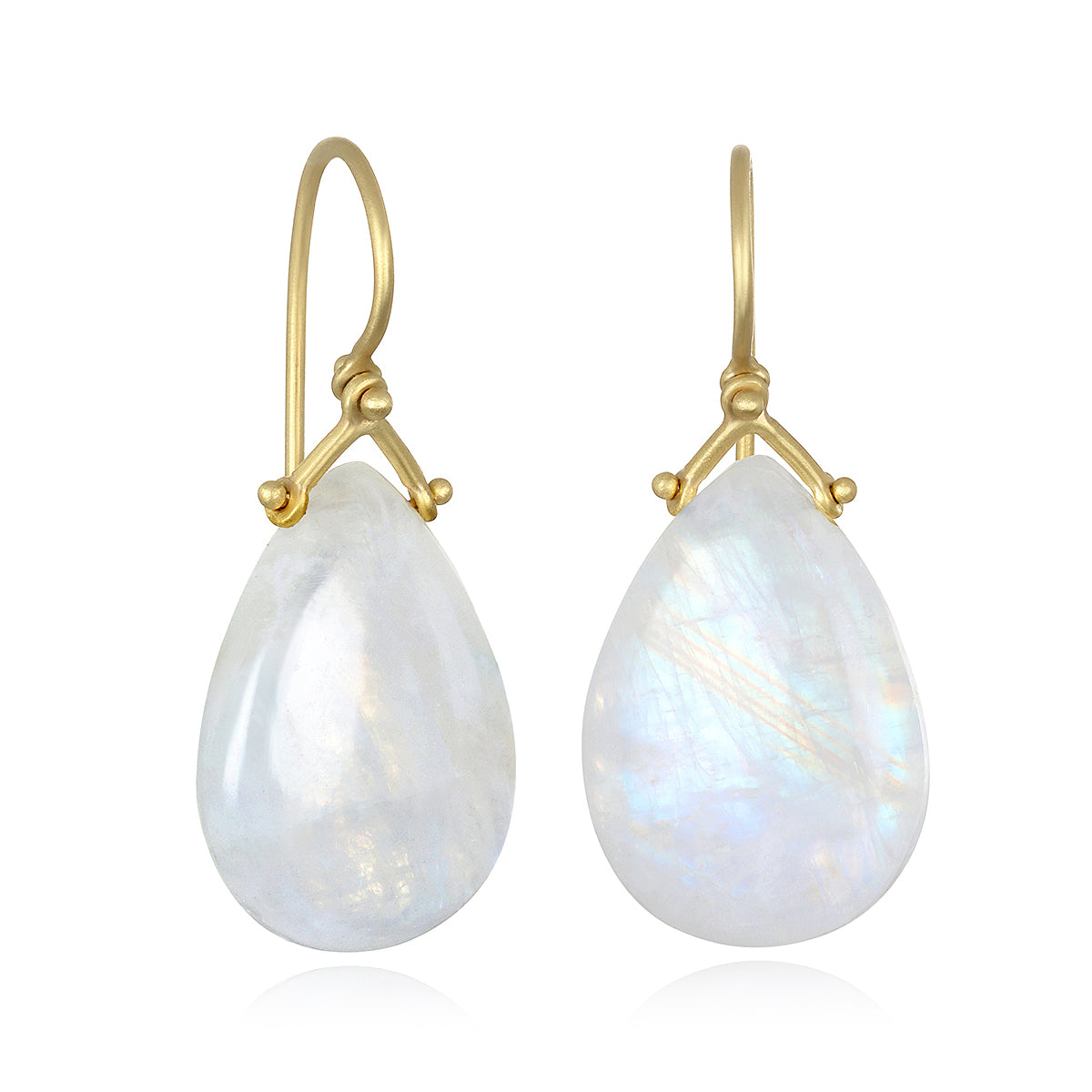 18 Karat Gold Rainbow Moonstone Pear-Shape V-Cap Earrings
