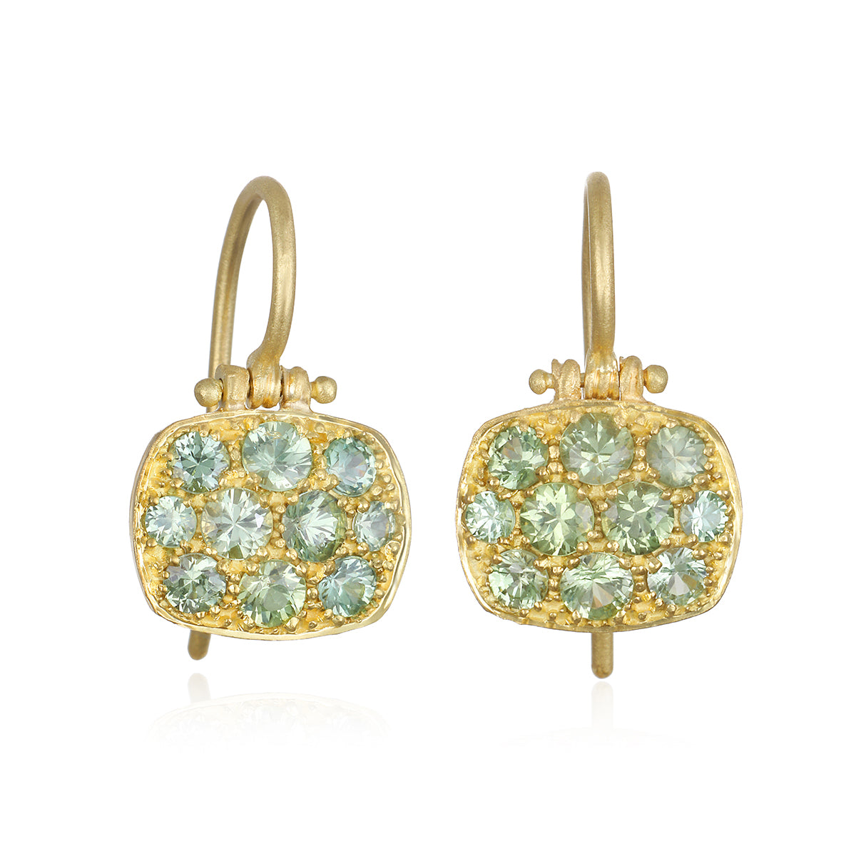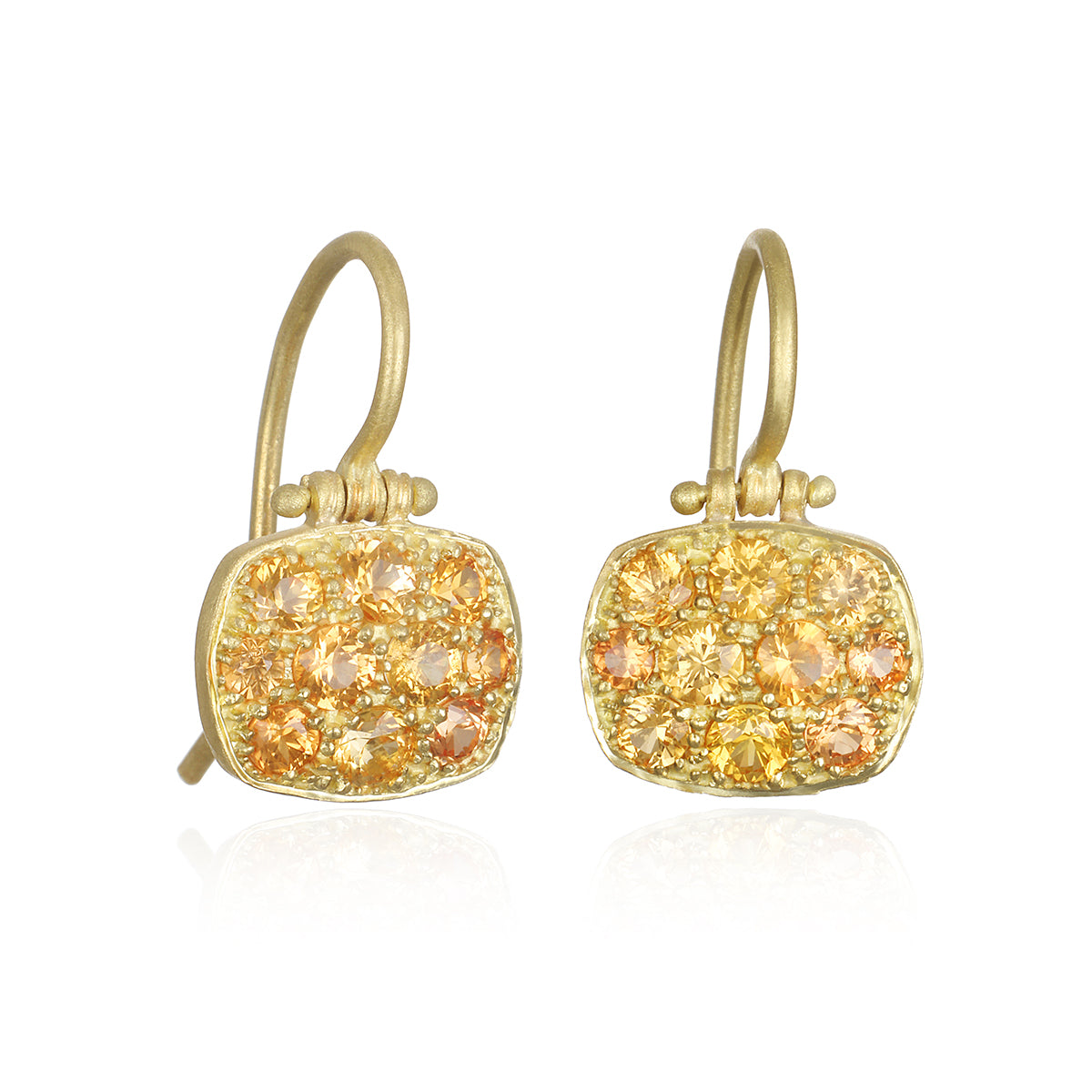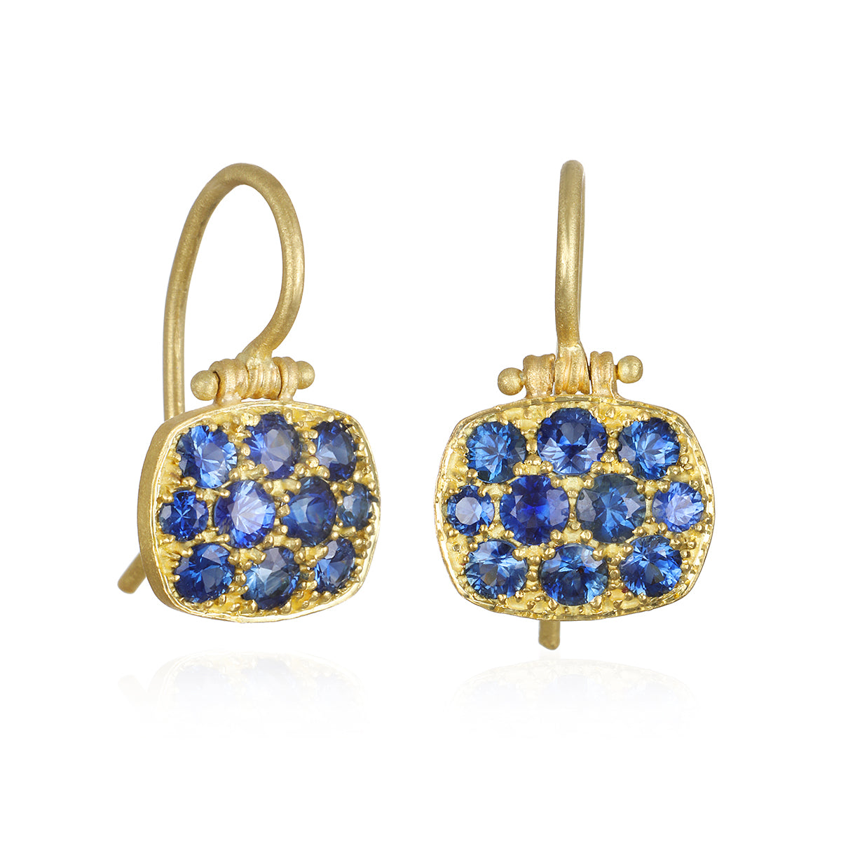 18k gold sapphire pave chiclet earrings with hinged ear wires.