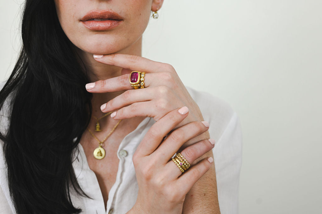 Models shown wearing similar style rings. Second photo shows size comparison of Faye Kim's Bubble/Granulation Bead Rings.