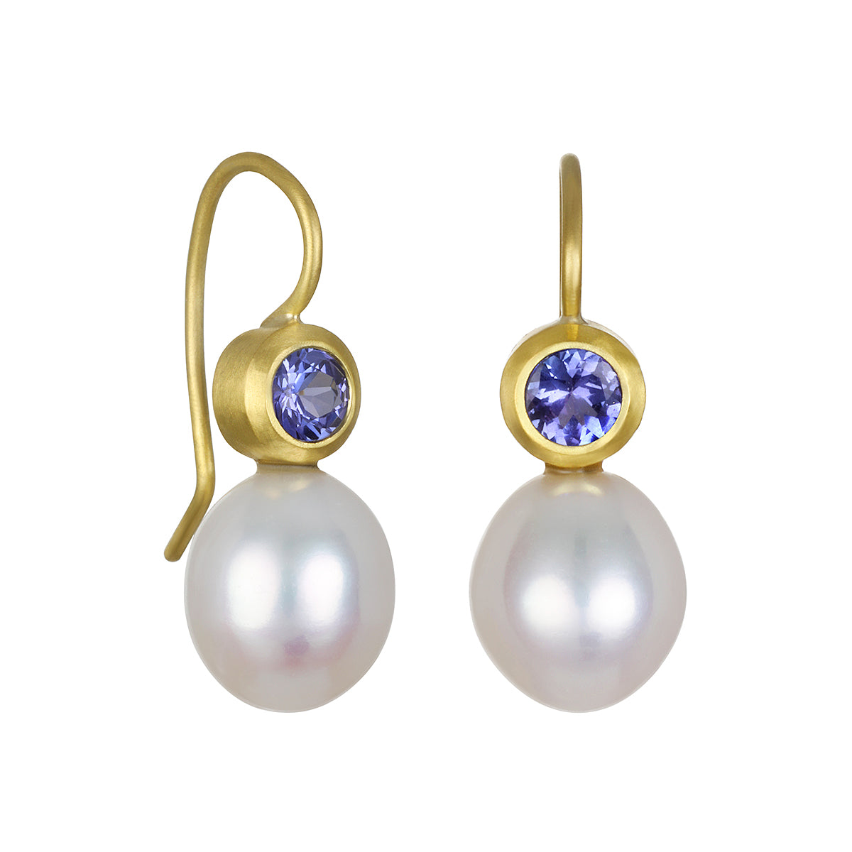 18k gold white freshwater Pearl drop earrings with faceted Tanzanite bezels