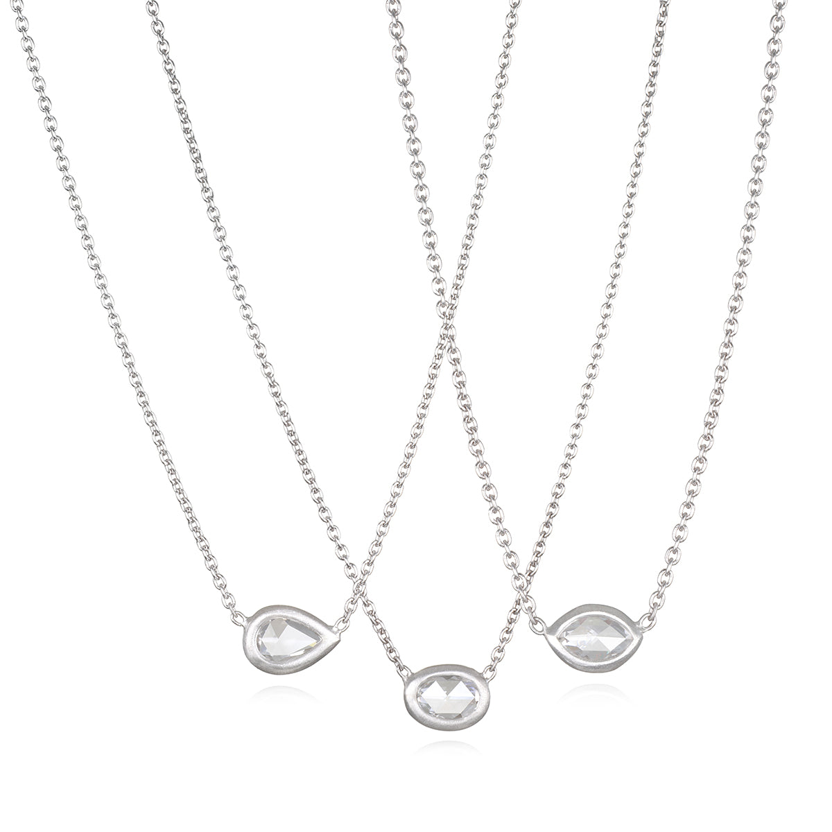 Photos also show similar marquise and pear shaped diamond necklaces, sold separately.