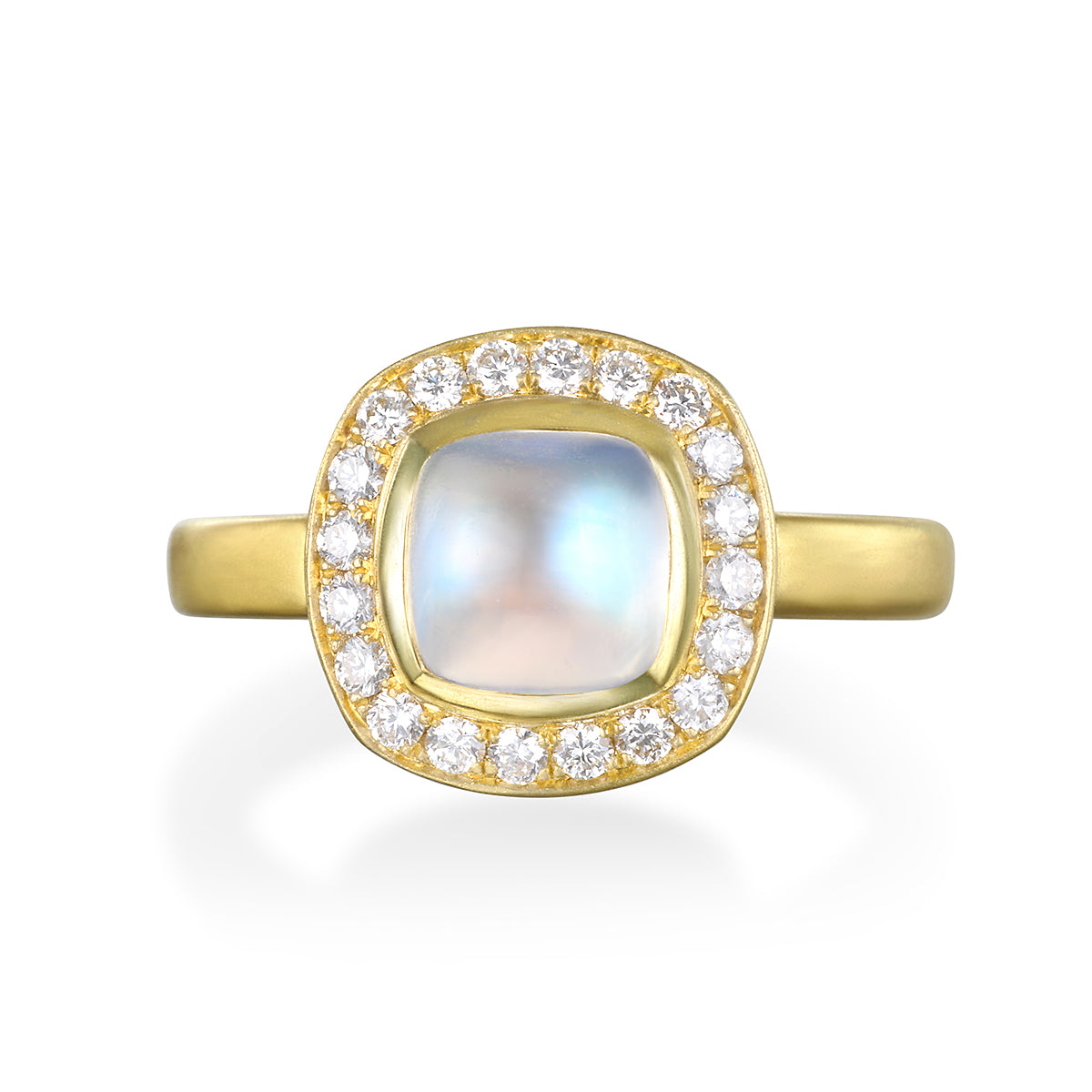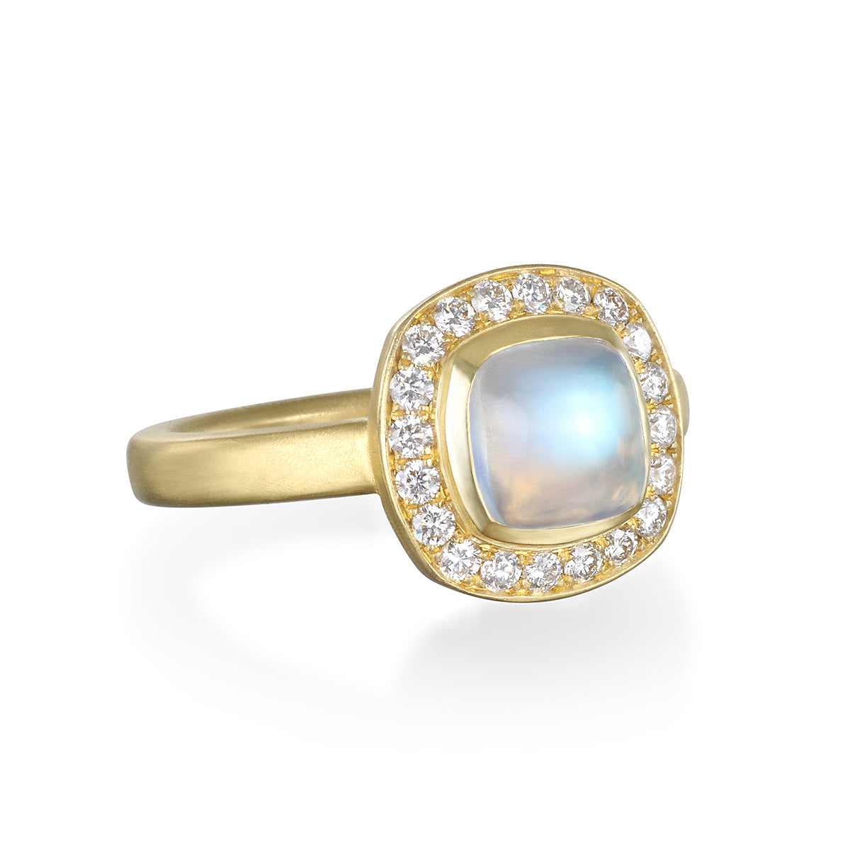 18 Karat Gold Diamond Halo Blue Moonstone Ring