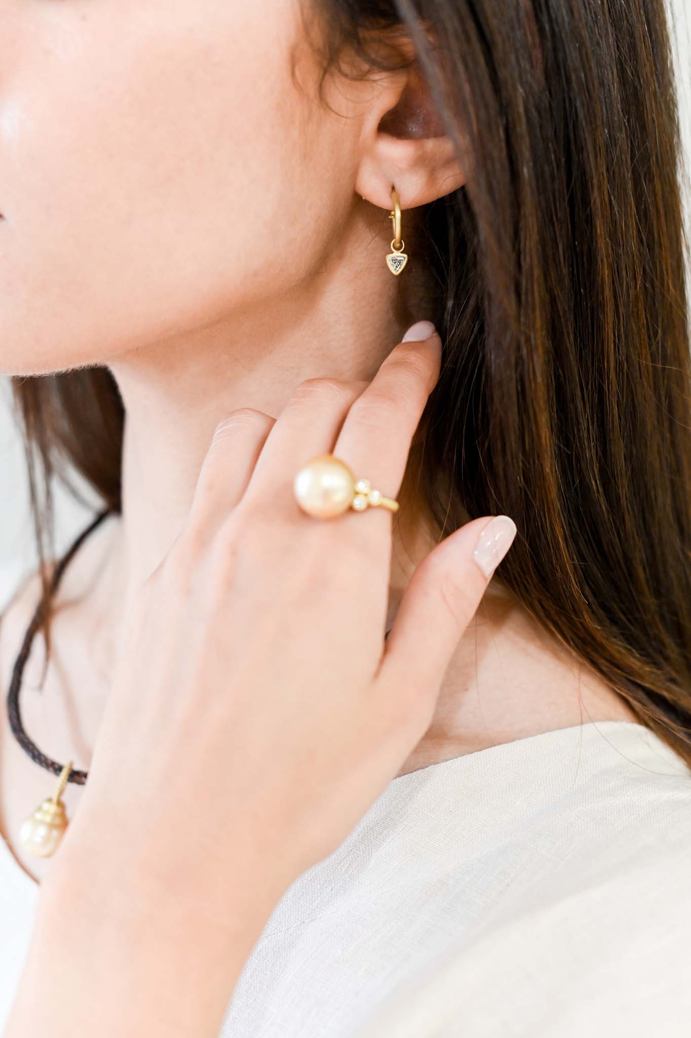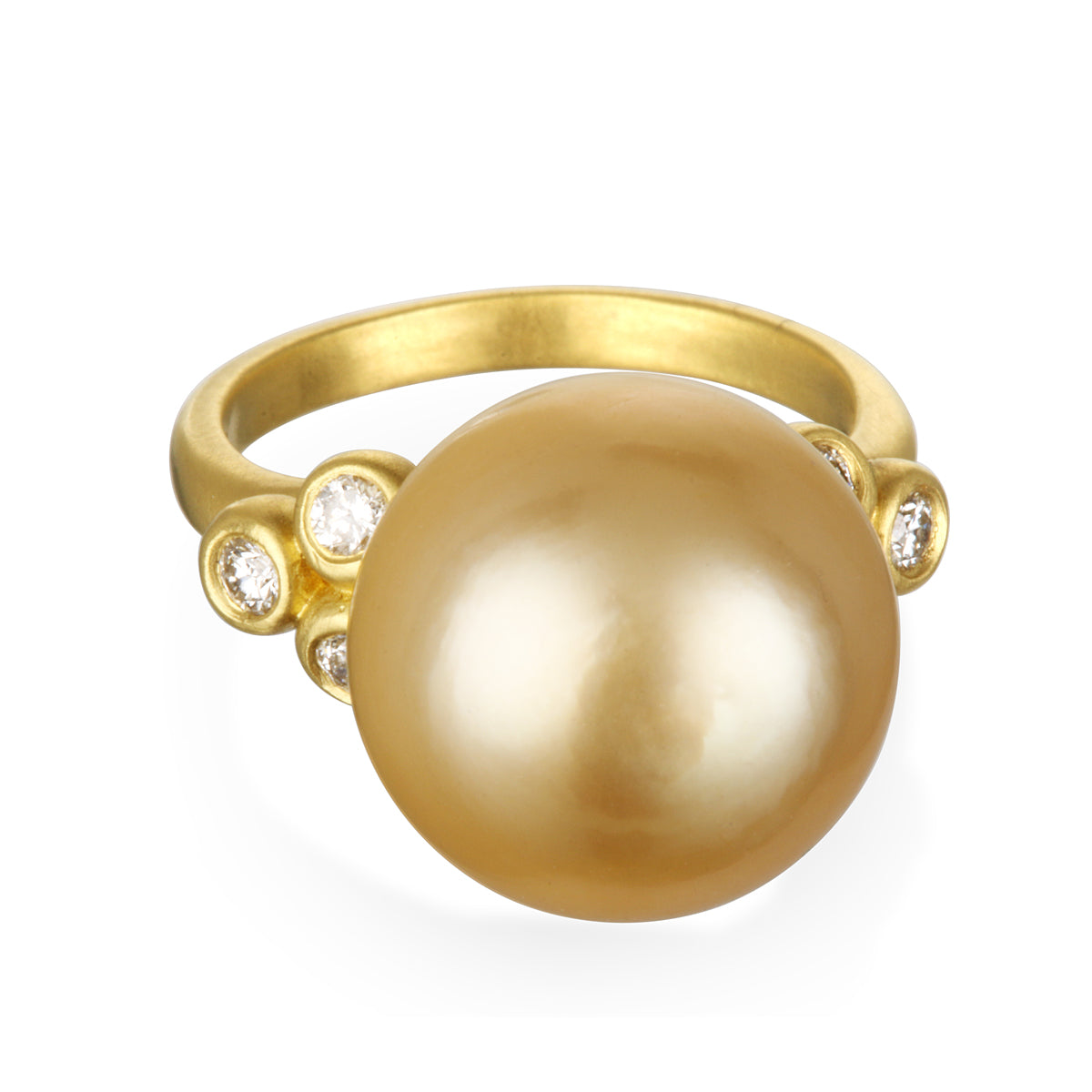 18k gold golden South Sea Pearl ring with triple diamond side granulation beads