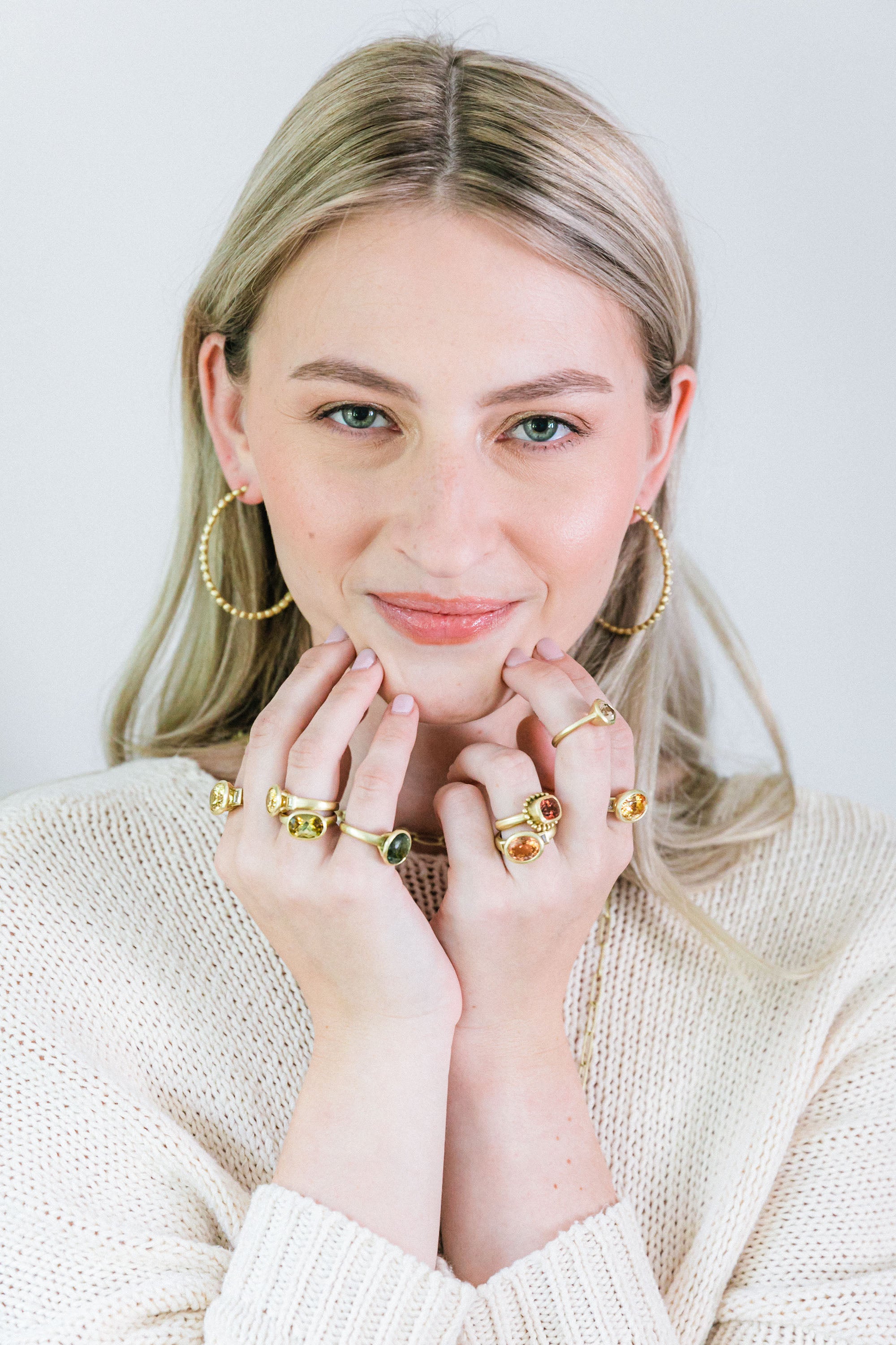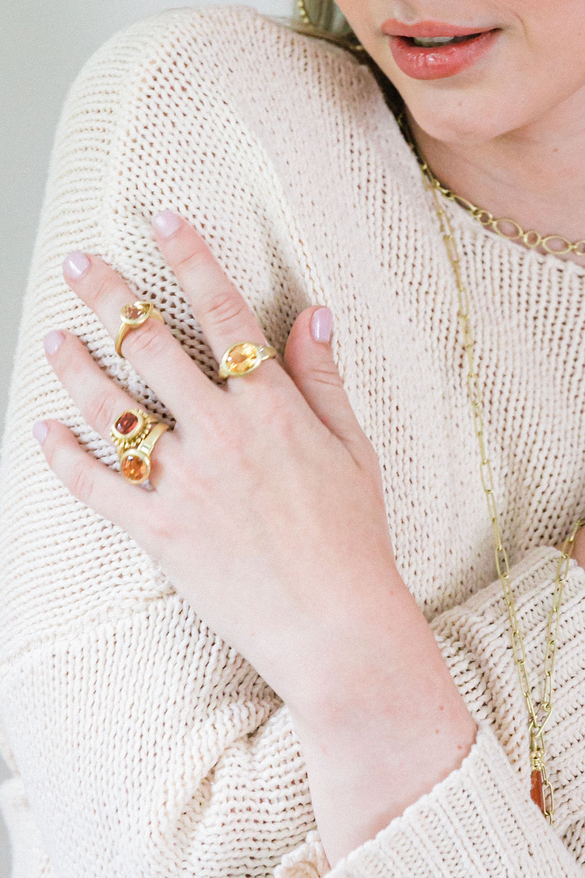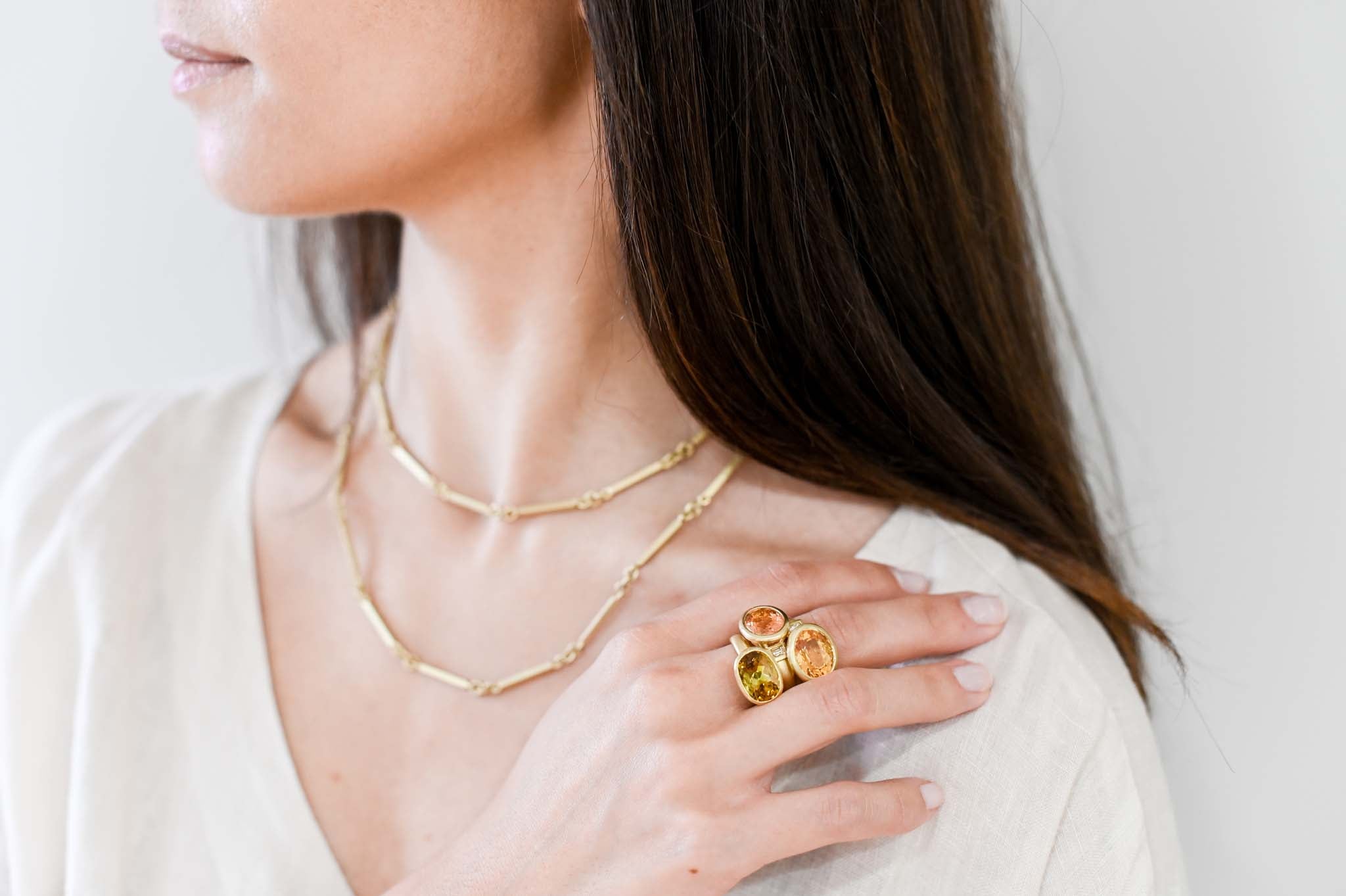 An updated version of the classic three-stone ring. Beautifully handcrafted in 18k gold, a fancy colored "Pink-Peach" Tourmaline is flanked by 2 bright white diamond baguettes.