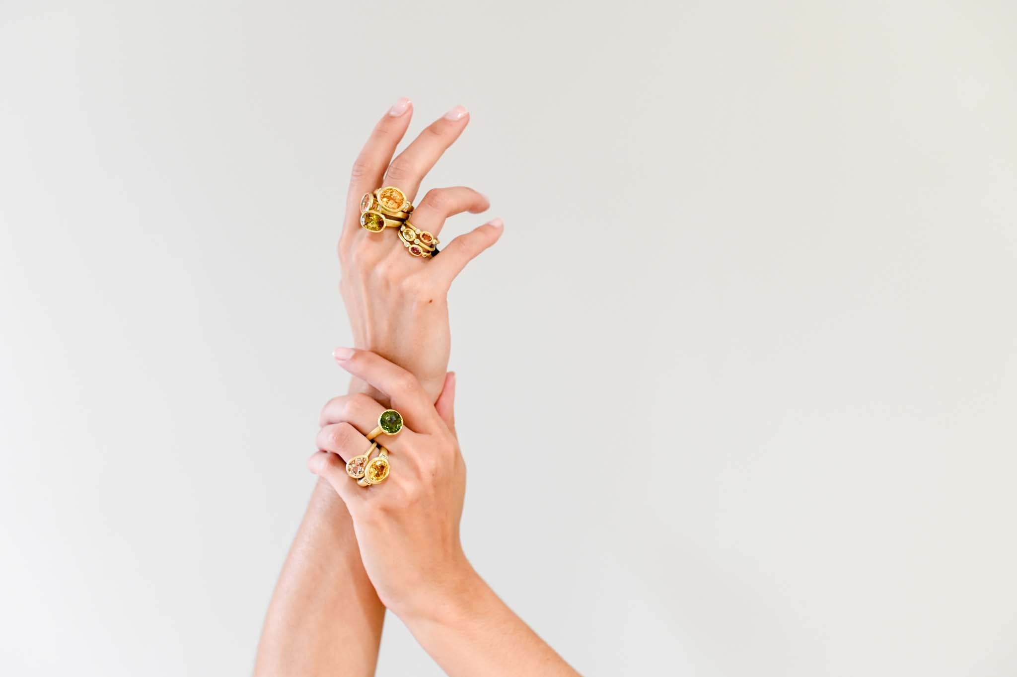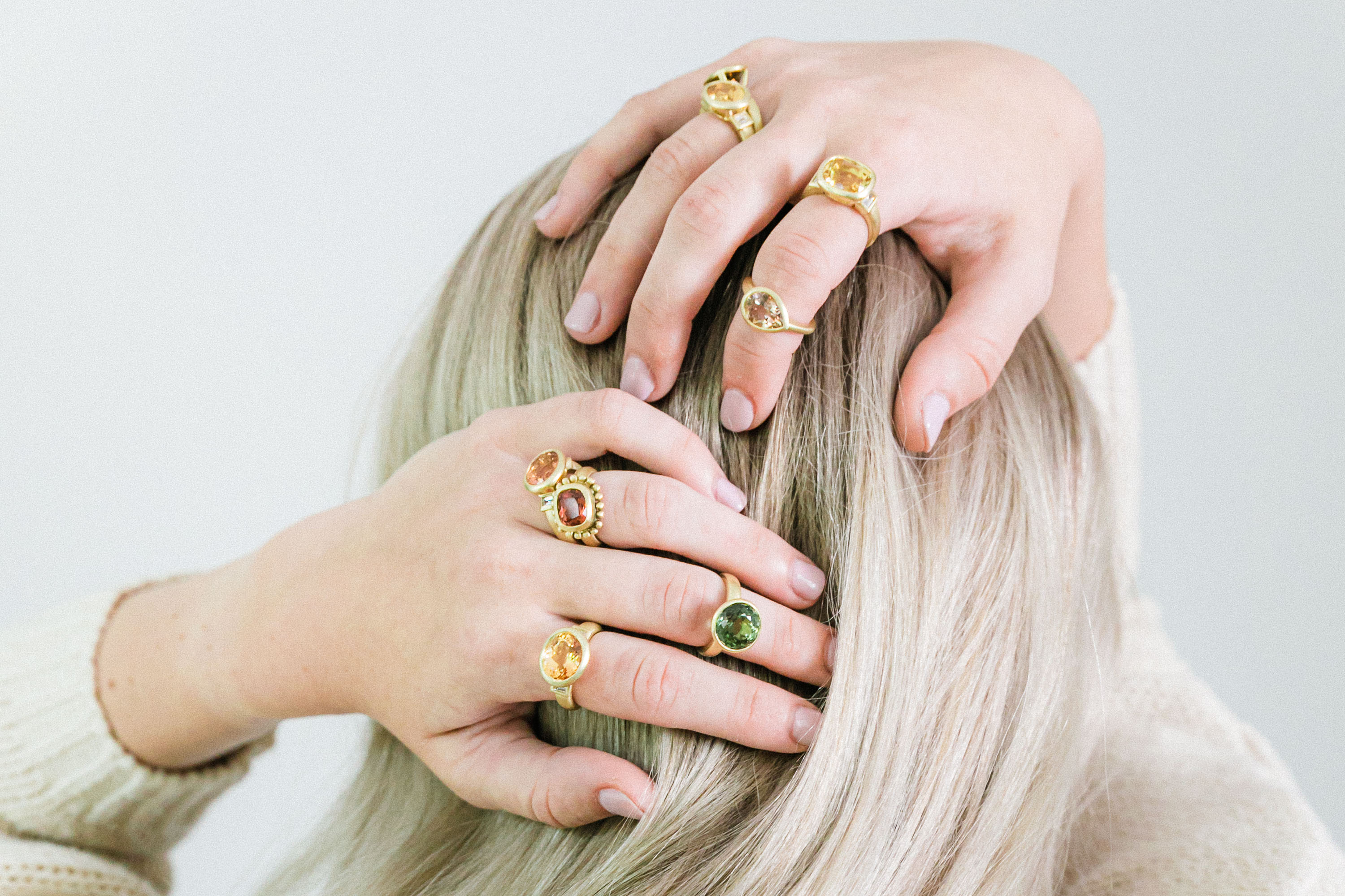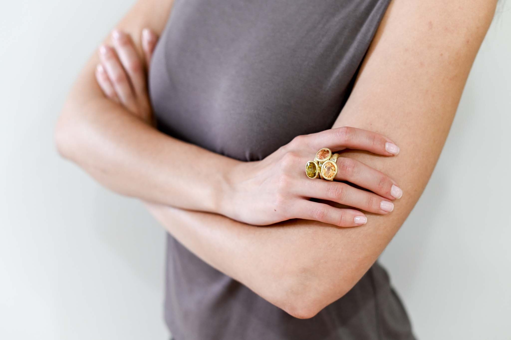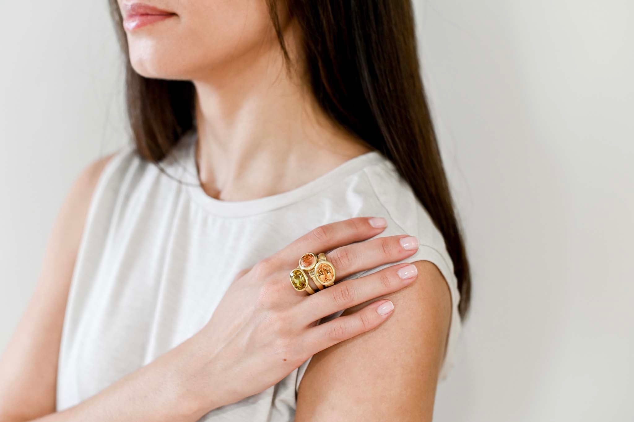An updated version of the classic three-stone ring. Beautifully handcrafted in 18k gold, a fancy colored "Pink-Peach" Tourmaline is flanked by 2 bright white diamond baguettes.