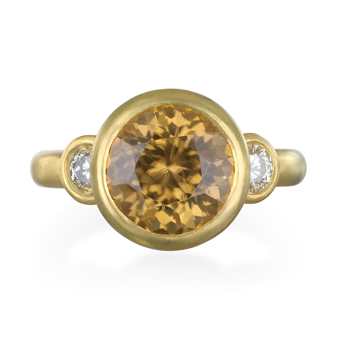 One of a kind and unique. Zircon is a colorful gem with high refraction and fire. Evident in this Champagne-hued stone, set in 18k gold with bright, white diamonds. The center stone has incredible fire and sparkle, highlighted further by the bright white diamonds. The sophisticated shade in a golden-champagne hue makes in versatile and very wearable.